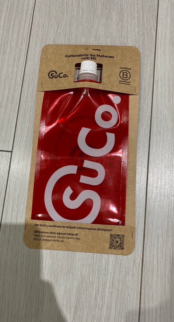600 ml kapasiteye sahip kırmızı katlanabilir su şişesi, gri kapaklıdır ve taşımaya uygundur. SuCo markasına ait. Sadece bir defa su doldurulup boşaltıldı.
