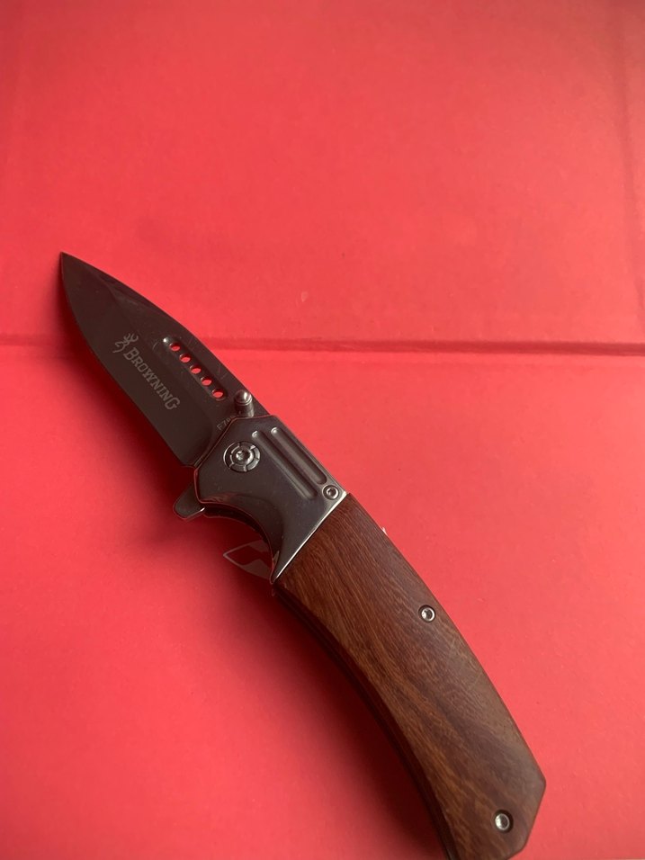 Koyu bordo renkli bıçağı ve ahşap sapı olan katlanır bıçak, dayanıklılık ve klasik görünümü bir araya getirir. Bıçak üzerinde Browning markası bulunur.