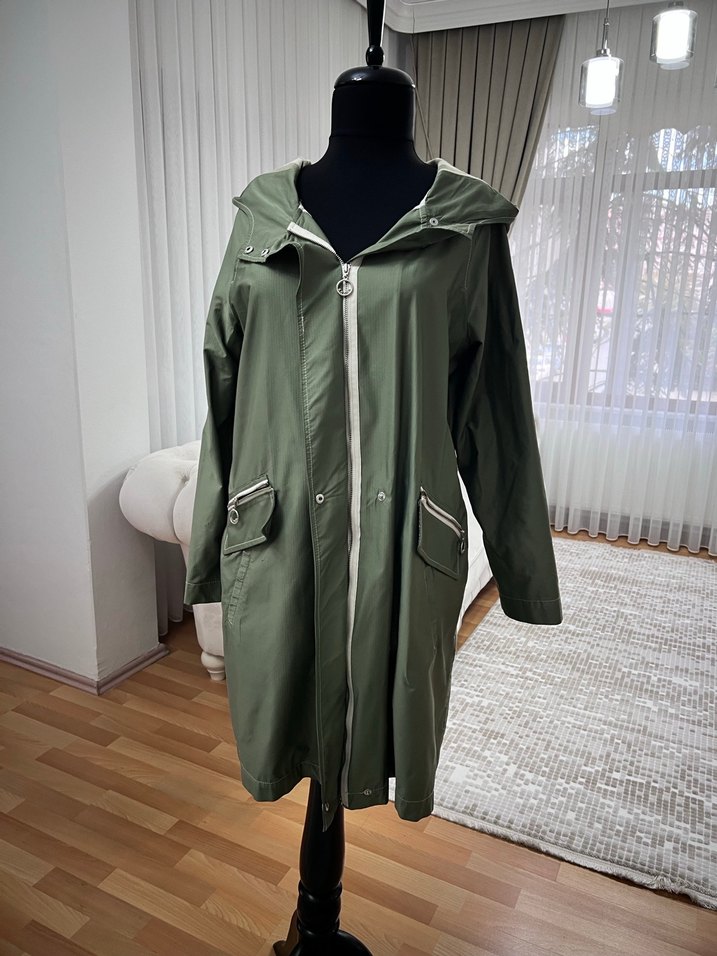Haki renkli, uzun kesim ve bol kalıplı kadın yağmurluğu. Fermuarlı ön kapama, cepler ve notlu yakaya sahip, sentetik kumaştan üretilmiştir. ️36/40 arası geniş rahat kalıp ,boy 85/ göğüs ölçüsü 60