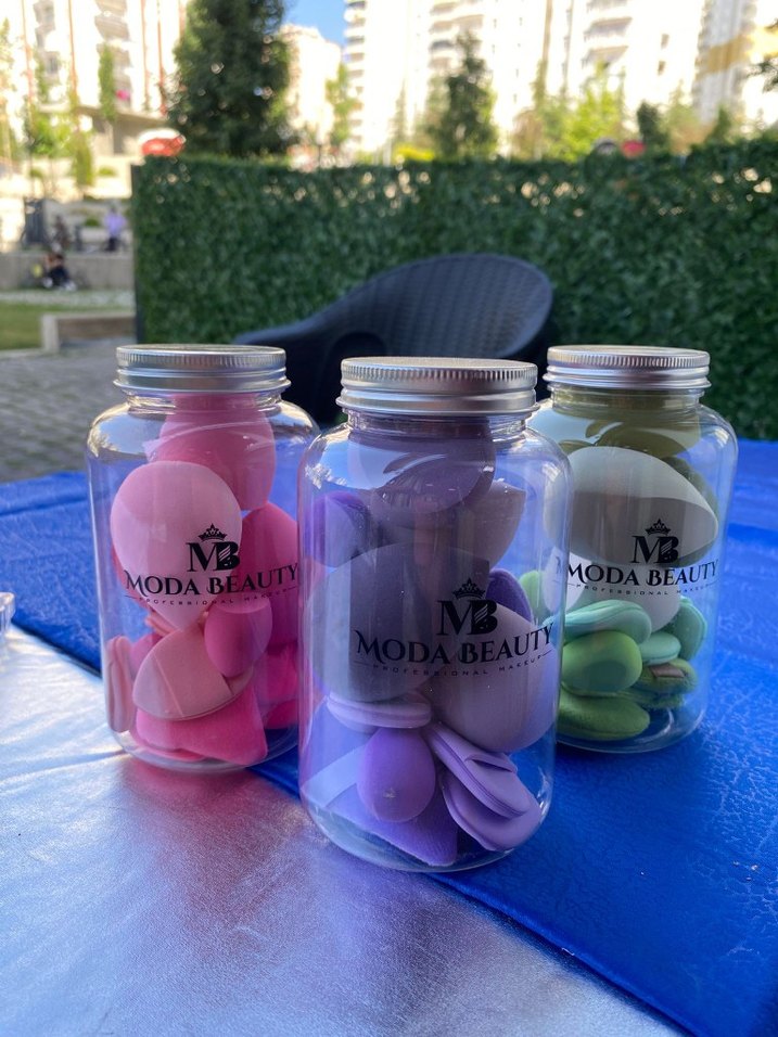 Pembe, mor ve yeşil pastel renklerde makyaj süngerleri, şeffaf kavanozlarda ve gümüş kapaklıdır. Üzerinde MODA BEAUTY logosu bulunur. içinde 12 - 14 adet mevcuttur