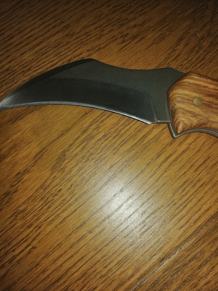Kavisli bıçağın koyu renkli bıçağı ve kahverengi ahşap sapı bulunur, hassas kesim için uygundur. ️