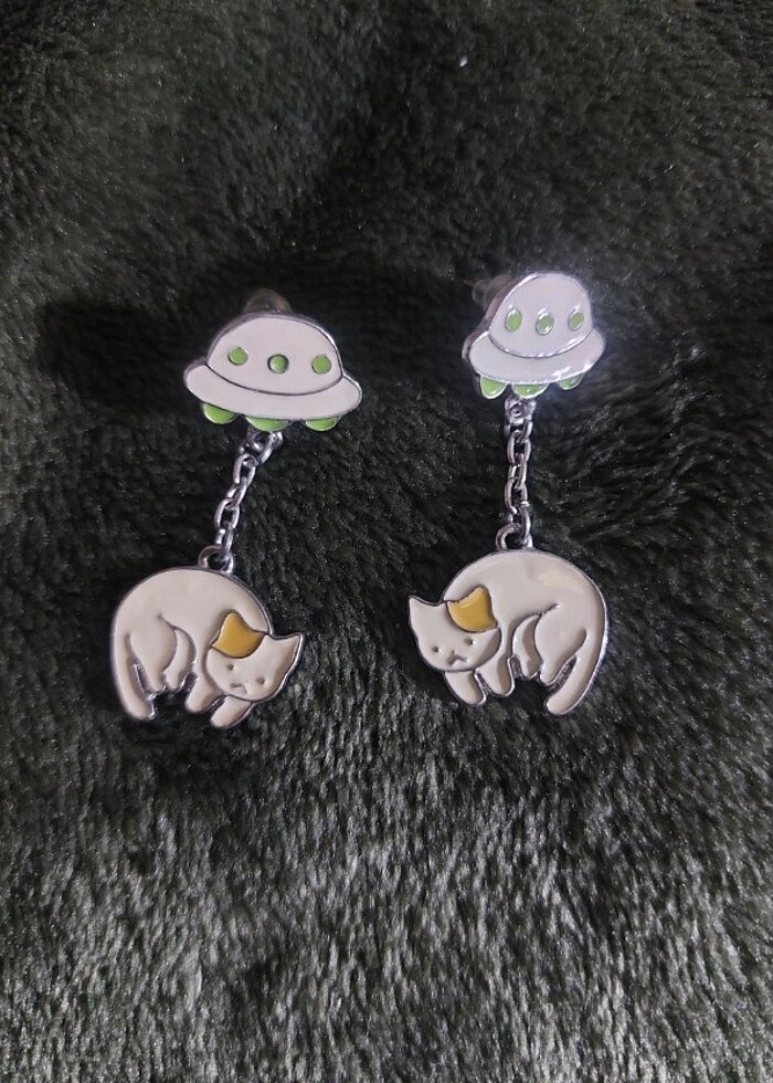 UFO tarafından kaçırılan kedi şeklinde küpe. Hiç takmadım, çok tatlı olduğu için almıştım ama tarzım değil