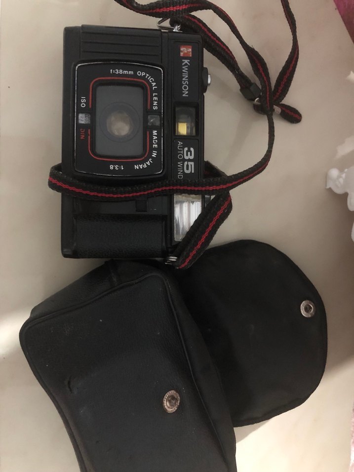 Siyah Kawason 35mm film fotoğraf makinesi, 38mm f/3.8 lens ve otomatik film sarma özelliği ile birlikte gelir. Taşıma çantası ve askısı vardır.