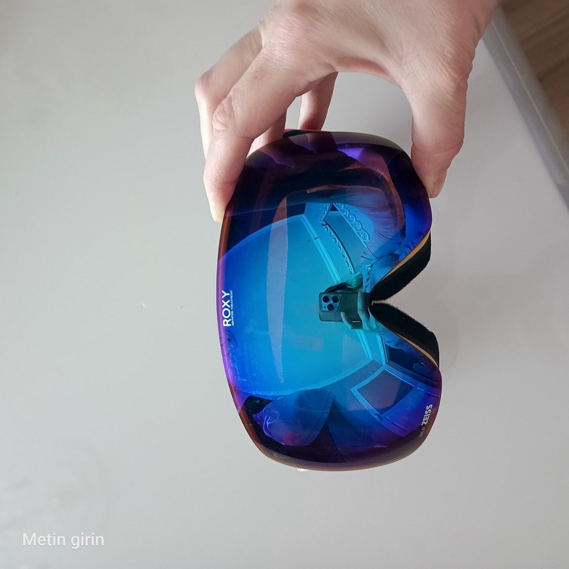 Erkekler için koyu mavi parlak cam lensli, baskılı tasarıma sahip kayak gözlüğü. Avant-garde biker stiline uygundur. Marka: Roxy. salıce quiksilver cesitli markalarsa