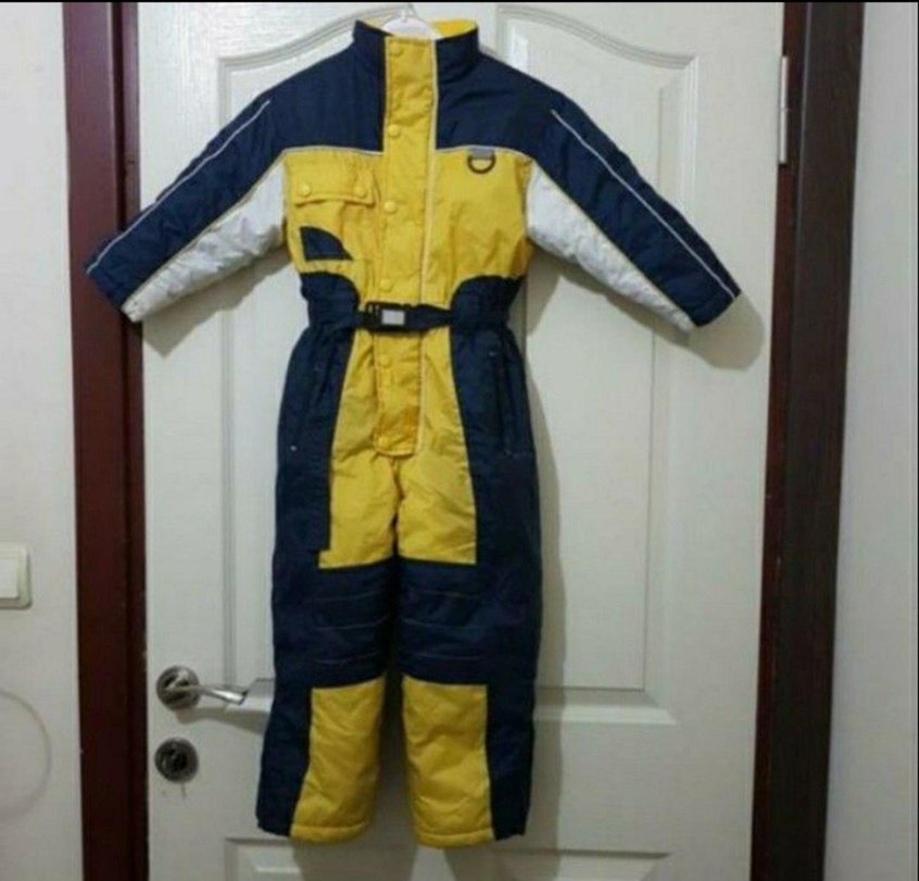Kemerli bel kısmı ile sarı ve lacivert renklerde kayak tulumu. Yumuşak ve sıcak kumaştan, desen içermeyen unisex model sıcacık tutar ❄️