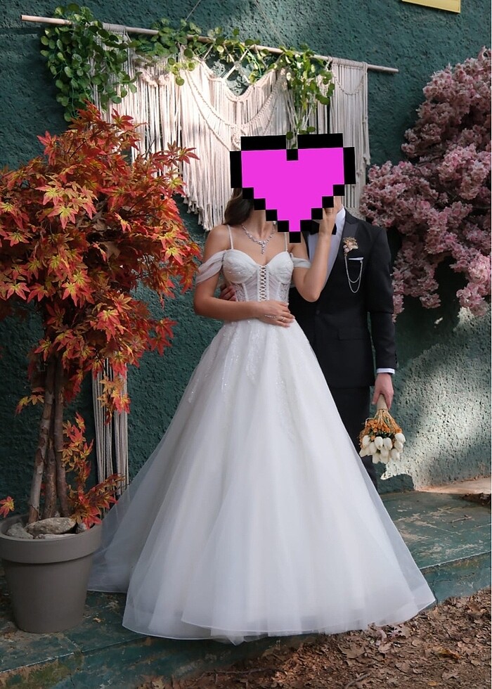 Janroz marka Ekru Kayık Yaka İşlemeli Balen Korse Uzun Gelinlik özel yaprak kristal boncuklu ip askısı ve düşük kol mevcuttur. saten iç astar hayal tül ve simli tül üst katmanda bulunmaktadır.Arkası iplidir ayarlabilir.Deformasyonu yoktur. Kuru temizleme yapılmamıştır.Gelinlik ile birlikte tarlatanı ve duvağida verilecektir. Beden=36-38 uyumludur Boy=160 boyunda +10 cm topuklu ile giyilmiştir