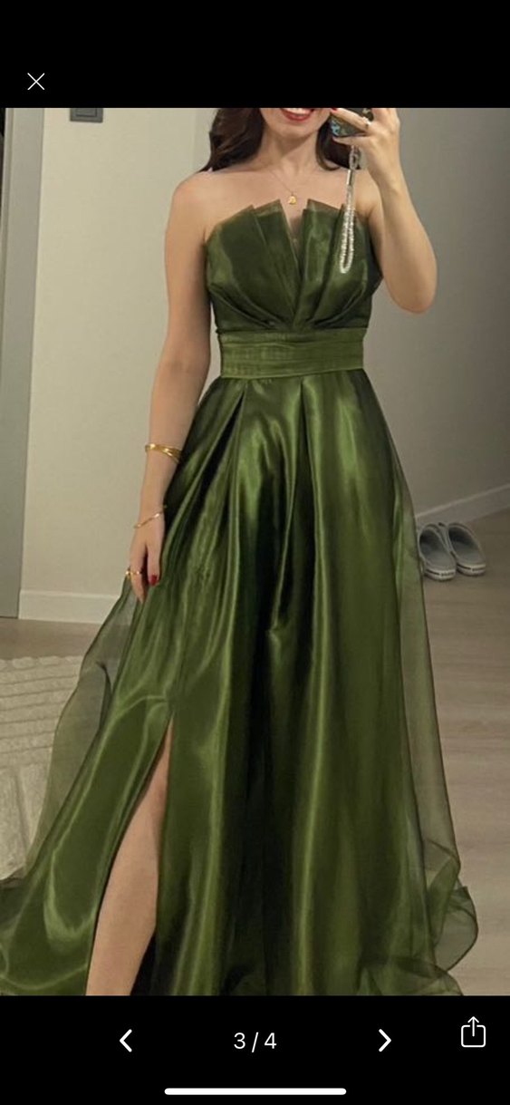 Kayık yaka ve drapeli detaylara sahip, uzun ve bol kesim haki renkte parıltılı elbise. Modern klasik tarzıyla ofis için uygun, kolsuz ve desensizdir. ✨