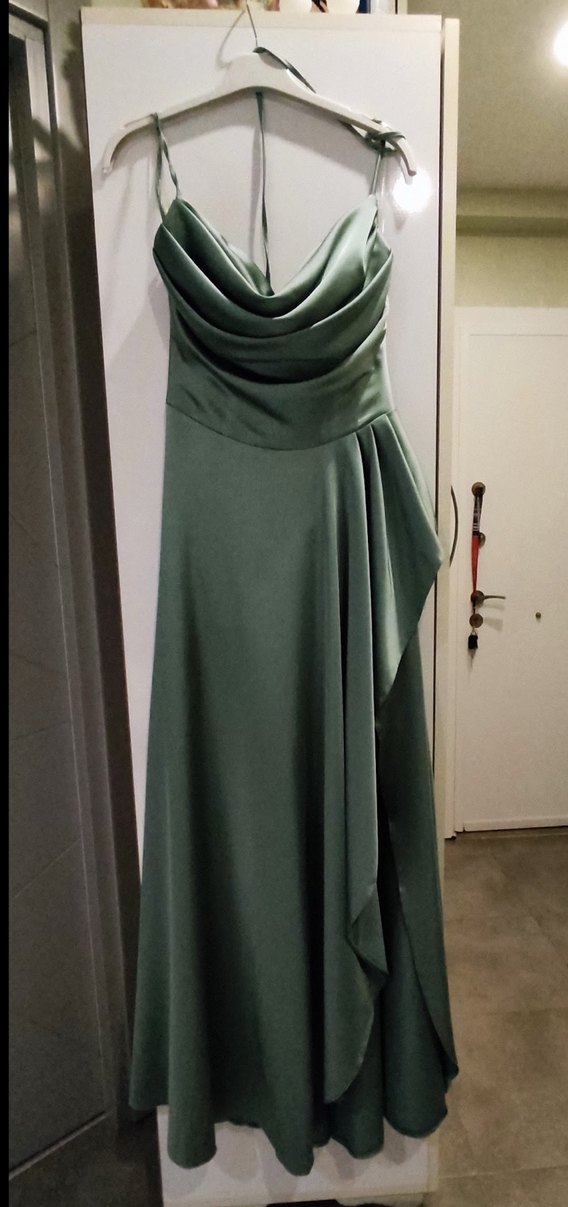 Kayık yaka, drapeli ve kolsuz tasarıma sahip, uzun ve vücuda oturan abiye elbise. Minimalist ve çağdaş tarzda, düğünler için uygun. 1 kere giyildi, tertemiz. Arkası bağlamalı olduğu için 36 / 38 hatta 40 bedene kadar olur.