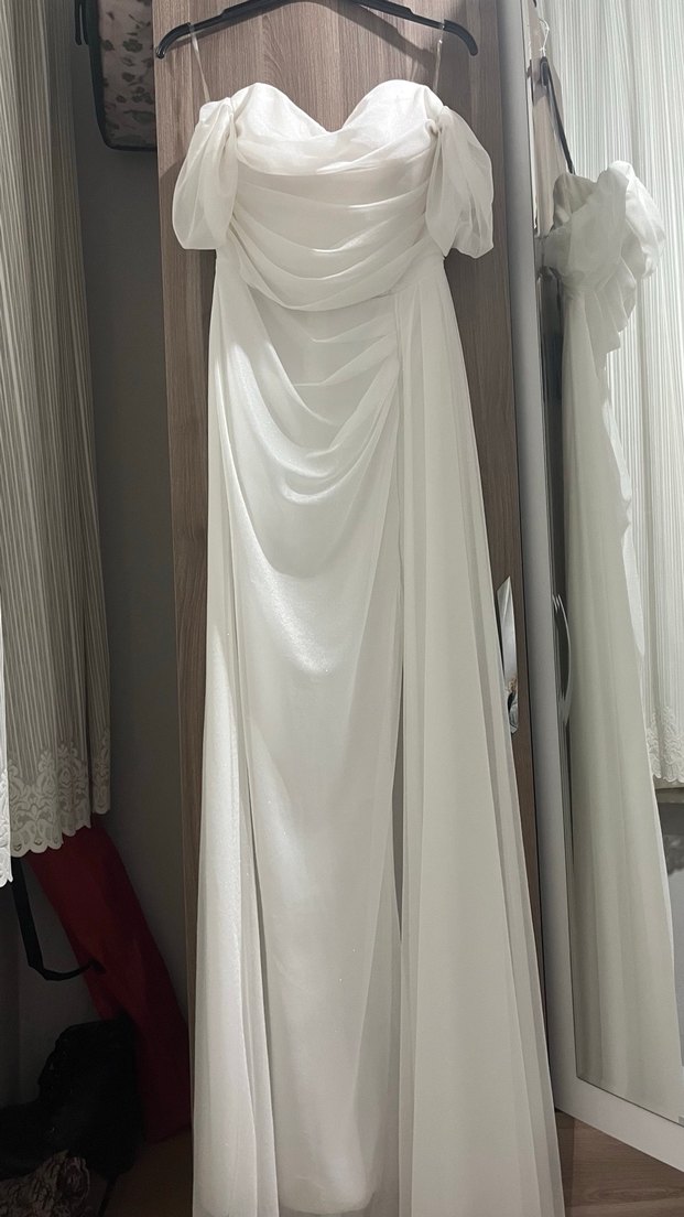Beyaz, straplez gelinlik, modern klasik A kesim ve vücuda oturan tasarıma sahiptir. Drapeli detayları ve kolsuz yapısıyla minimal şıklık sunar.