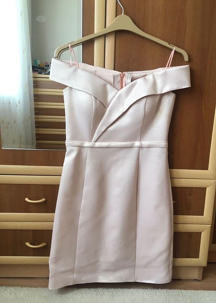 Kayık yaka pudra rengi. 1 geceliğine düğünde giydim. Defosu yok. Abiyeciden almıştım 36-38 bedene uyumlu. #uzunabiye #kısaabiye #geceelbisesi #düğün #kına #nişan #kısaelbise