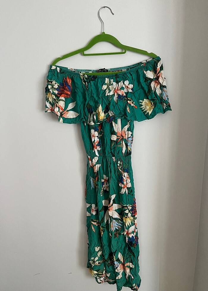 Omuzları açılan üstten lastikli kayık yaka elbise M beden. 3-4 defa giyilmiştir