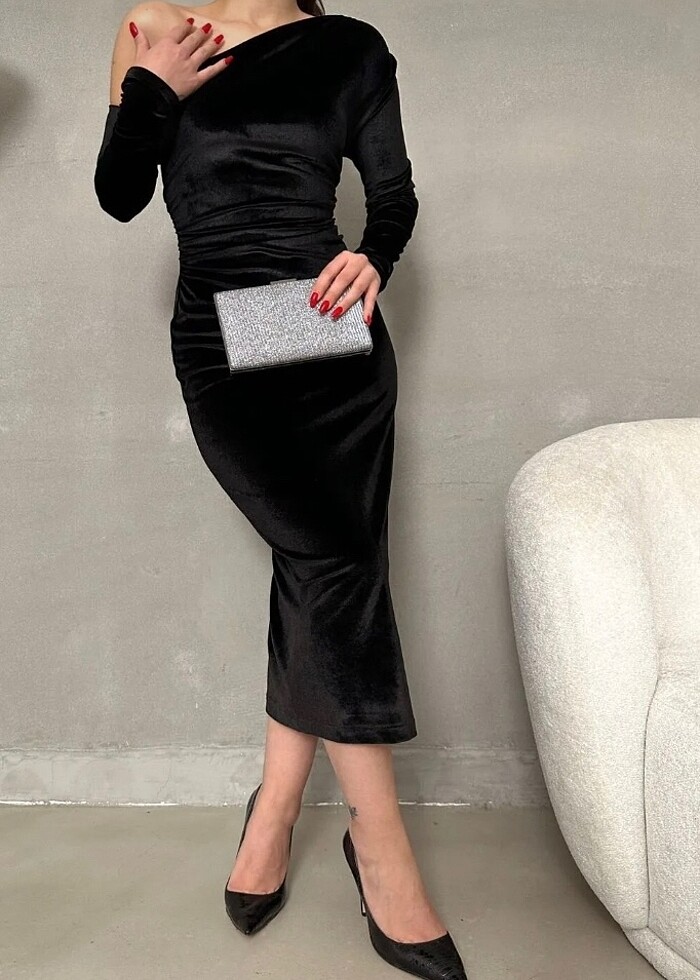 Kayık yaka kadife açık omuz siyah tasarım