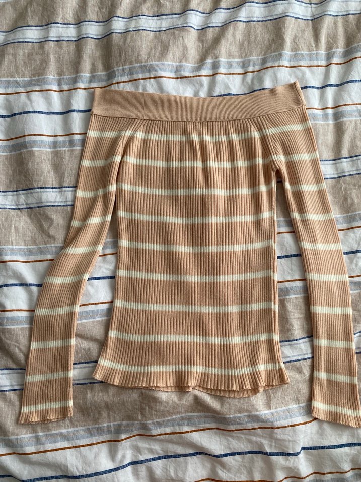 Bej renkte, kayık yaka triko kadın bluz. Sorunsuzdur
