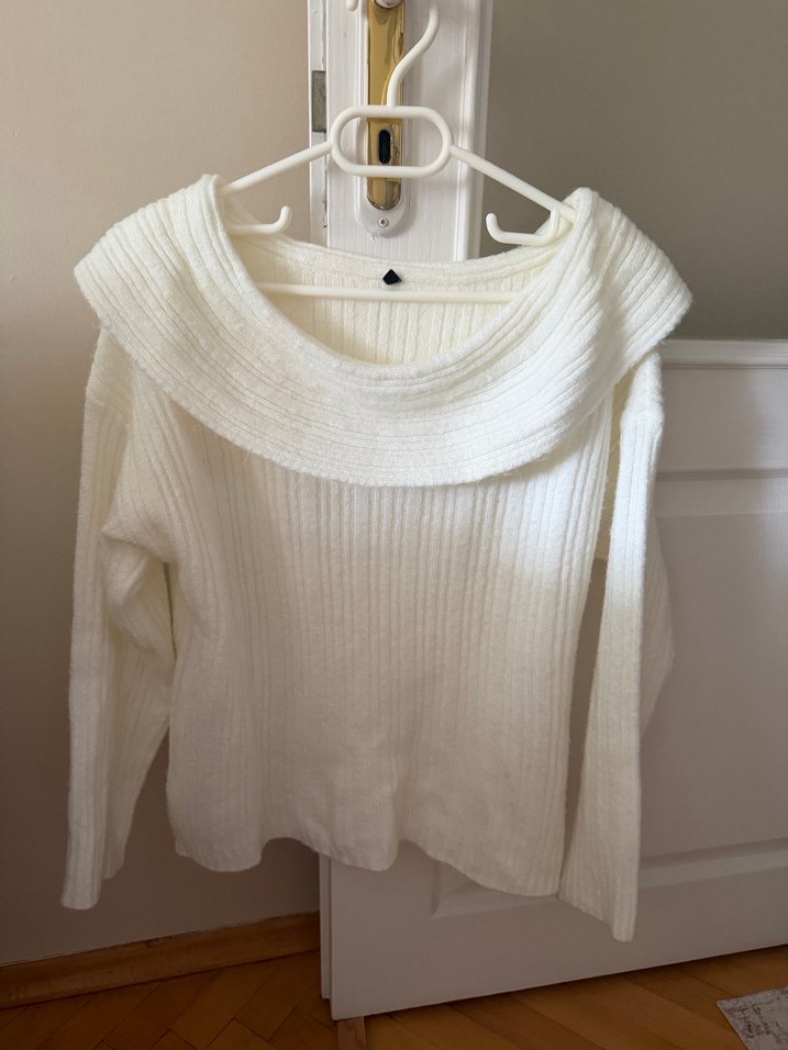 Beyaz örgü kayık yaka kazak, uzun kollu, bol kesim ve normal midi boyda, günlük sokak stili için uygun. Bir kaç kez gıydım