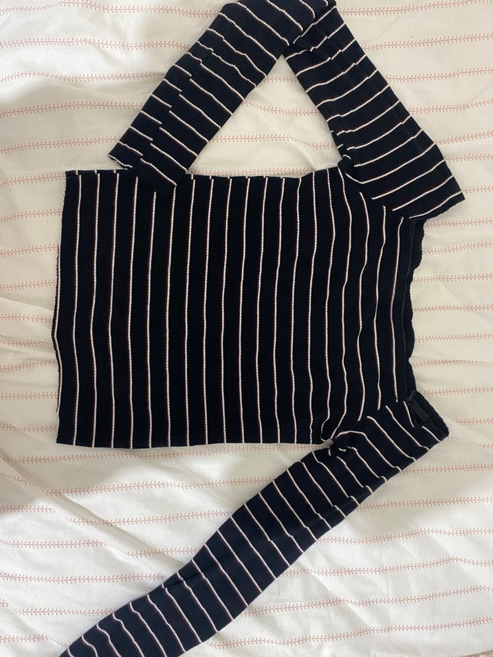 Dar kesim siyah hamile bluzu, uzun kollu ve kayık yaka. İnce beyaz çizgiler ve pile detaylarıyla minimalist sokak stili sunar.