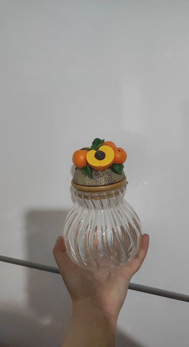 Burgu desenli şeffaf cam kavanoz turuncu meyve detaylı kapak ile süslenmiştir.