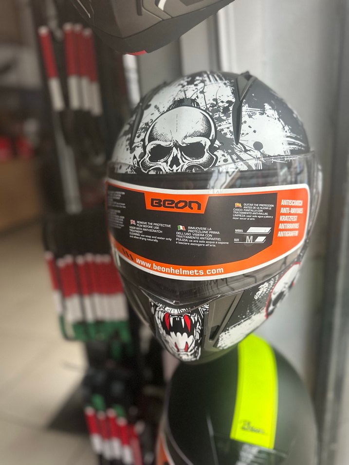 Kayışlı, lastik malzemeden yapılmış, üzerine baskılı gri kuru kafa desenli motosiklet kaskı. Grunge punk tarzını yansıtır. ️