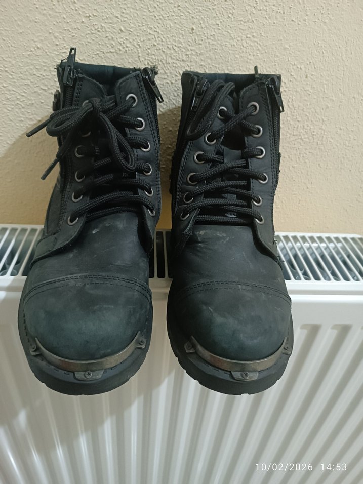 Kayışlı bantlar, bağcıklı ön kısım ve yan fermuarları olan siyah kauçuk erkek botları. Gri tonlarıyla rock punk ve goth tarzını yansıtır. Günlük kullanıma uygundur.