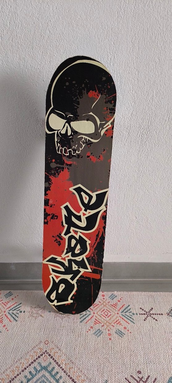 Kara ve kırmızı renklerde, kafatası figürlü ve grafiti tarzı yazılarla süslenmiş karanlık temalı kaykayıdır.