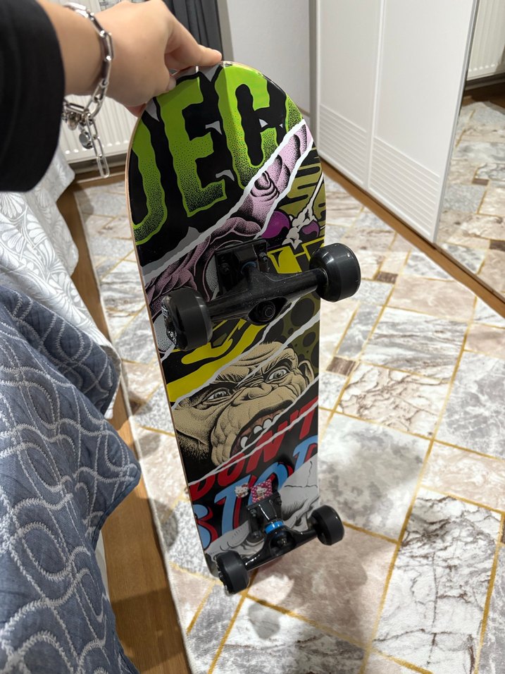 çok renkli ve koyu tonlarda grafiklere sahip kaykay. Dayanıklı siyah tekerleklerle eğlenceli bir sürüş sunar.