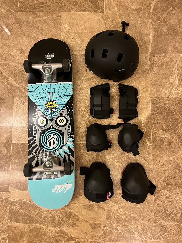 Mavi desenli kaykay ve lastik tekerlekler ile birlikte kask, bilek, dirsek ve diz koruyucuları velcro bantlı olarak sunulur.