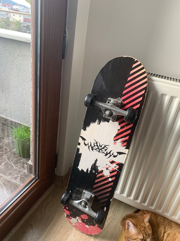 Genç sürücüler için sağlam tekerlekli, cesur grafik tasarımlı siyah genç kaykayıdır.