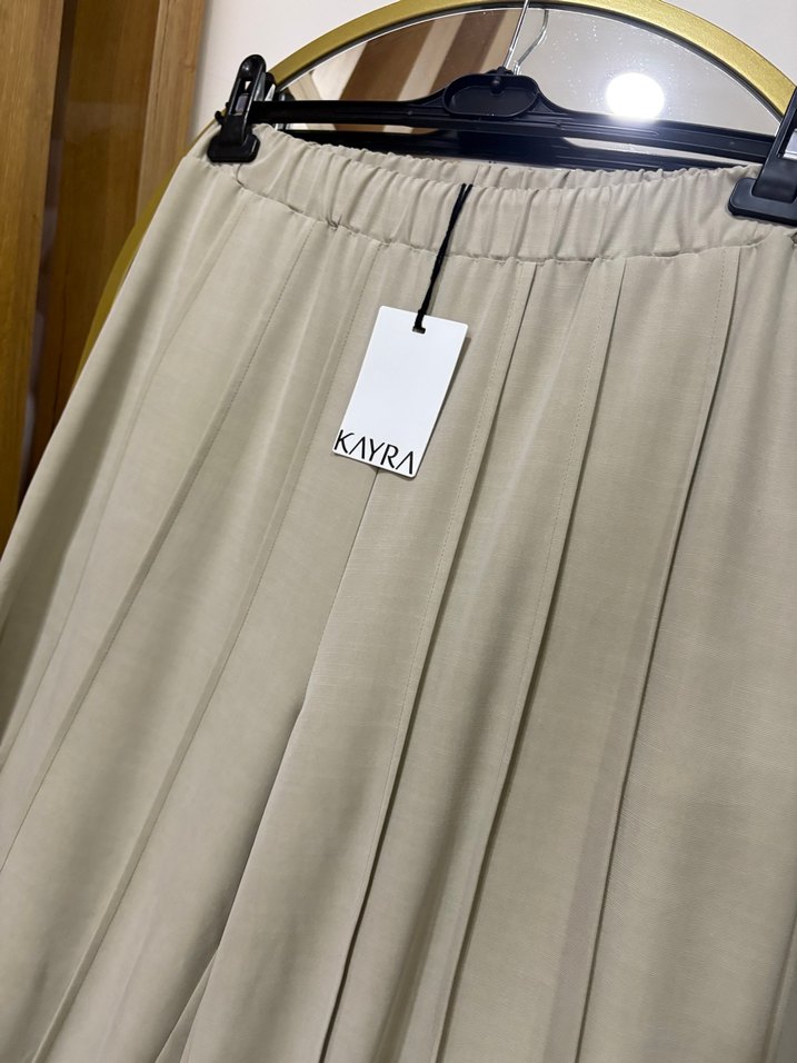 Kayra marka, bej renk keten kumaştan piliseli ve bol kesim pantolon aşırı güzeldir son beden
