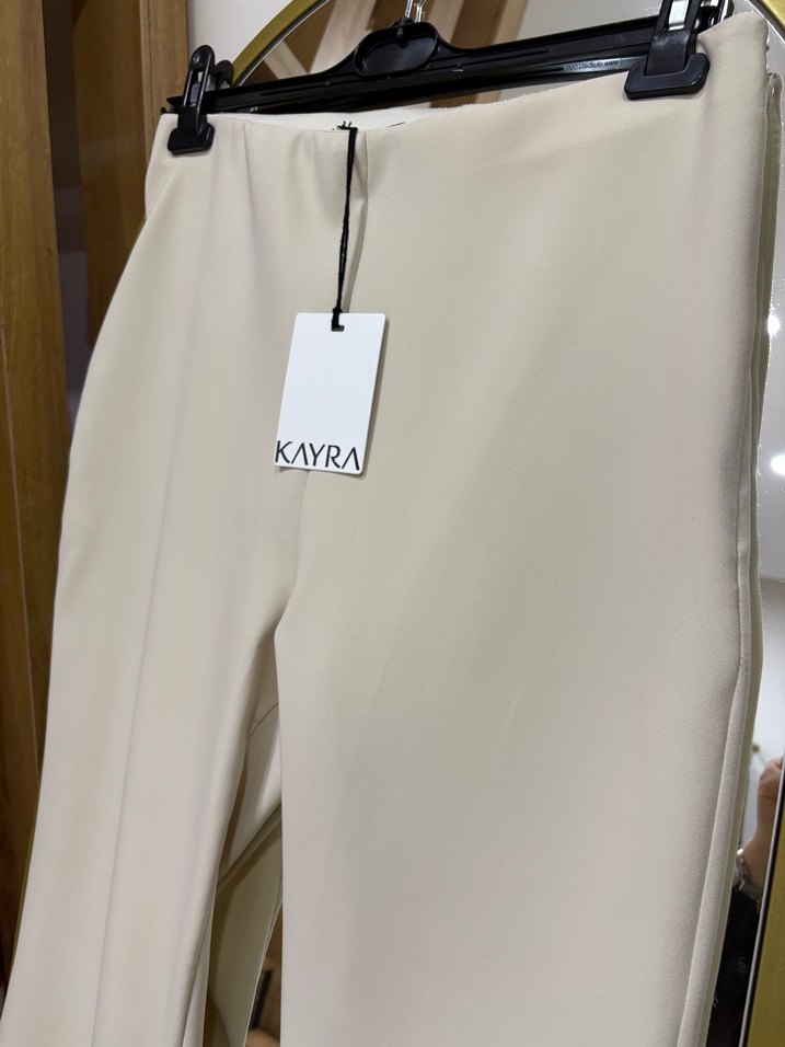 Kayra markalı beyaz midi boy kumaş pantolon, düzenli kesim ve fermuarlı detaylar içerir. Sokak modasına uygun tarzıyla ofis için idealdir, beli lastikli İspanyol paça pantolon 40 ve 42 bedenler mevcuttur