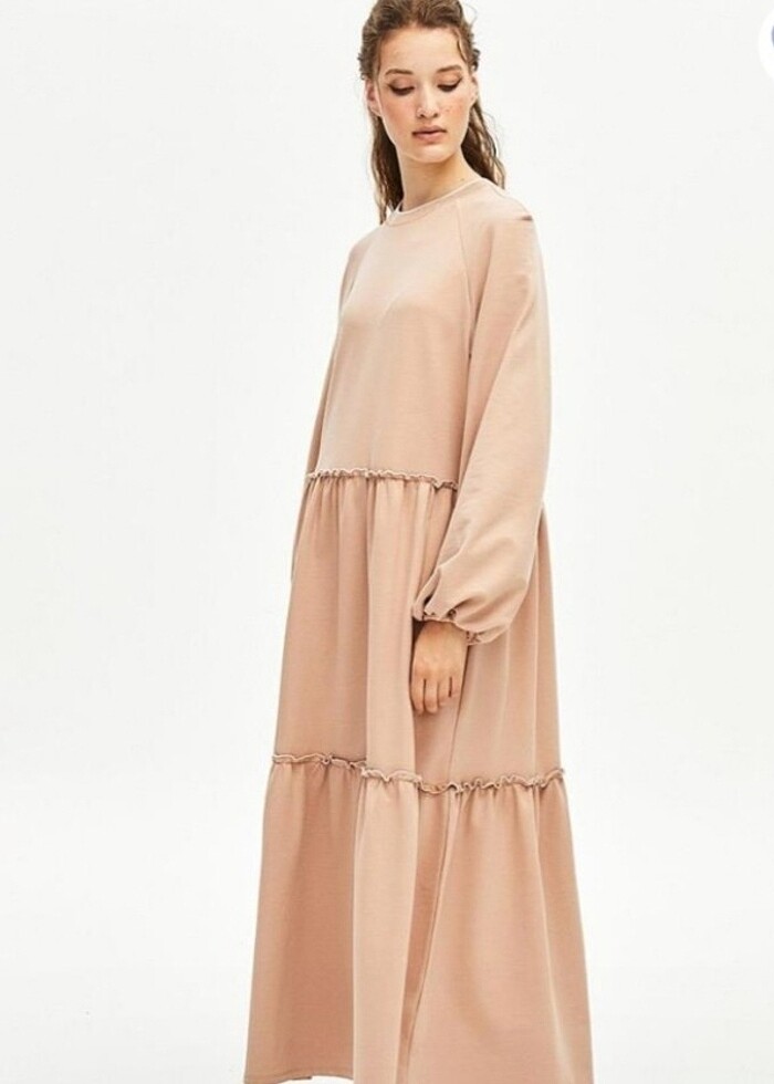 Ribana yaka, kol ucu lastikli, reglan kol ,roba ve tekten büzgülü balon kol elbise boy 135 cm hiç kullanılmamış