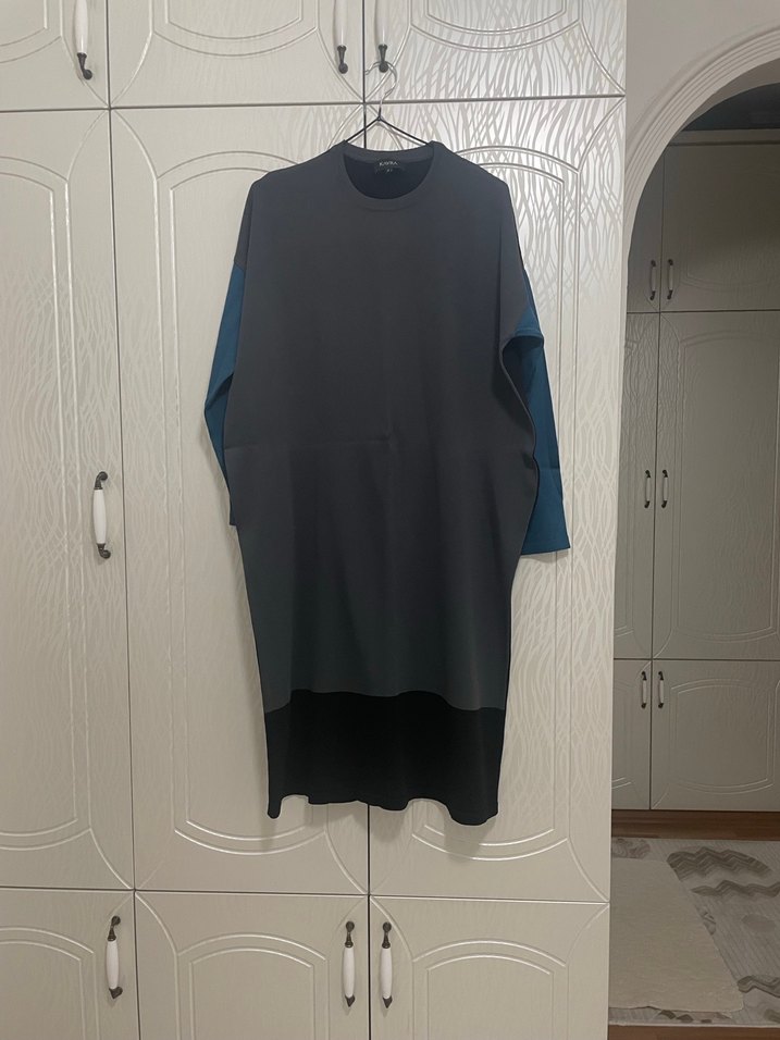 Koyu gri renkte, uzun kollu, yuvarlak yakalı, salaş kesim ve dökümlü tasarıma sahip soğuk iplik merserize tunik. günlük kullanıma uygundur. Ün kısmı füme arka siyah kollar petrol mavi temiz sayılı kullanıldı