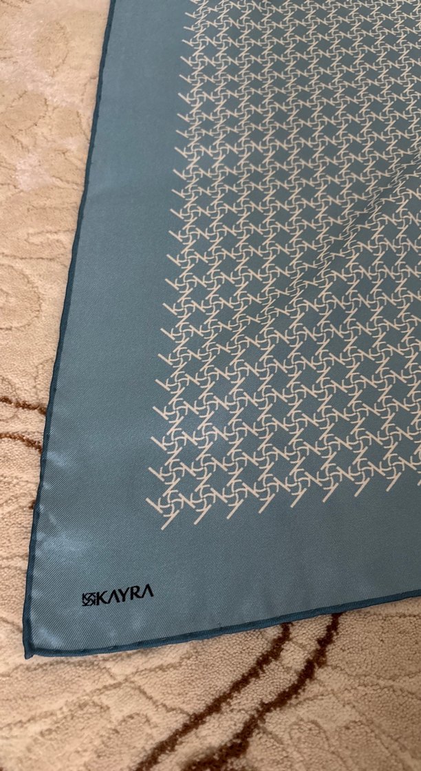 Zincir desenli vintage tarzda, mavi renkli, sentetik kumaştan yapılmış konvansiyonel kadın fuları. "BKAYRA" imzalı, mütevazı stile uygun. Kusursuz yeniden farksız