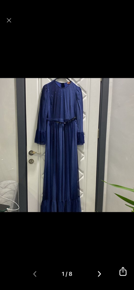 Kayra marka Uzun lacivert abiye elbise, yüksek yakalı, pile detaylı ve askılı kollu. Bağlama desenli, düzenli kesim, sade ve modern klasik tarzda, düğün için uygun. ✨bir kere düğünde kullandım tek kusuru ayakkabının topuğu takıldı hafif yırtıldı fotoğrafta mevcut amahiç belli değil giyerken kusuru yok başka