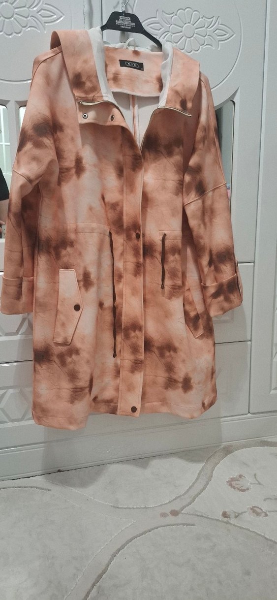 Pastel kahverengi ve pembe desenli, uzun ve bol kesim kadın kap ceket. Fermuarlı, uzun kollu ve yakası notched lapel olarak tasarlanmıştır. Rahat ve gündelik kullanıma uygundur. 2-3 kez kullanıldı, yepyeni, geçen sezon ürünü. uzunluk 90 cm, göğüs 62 cm.