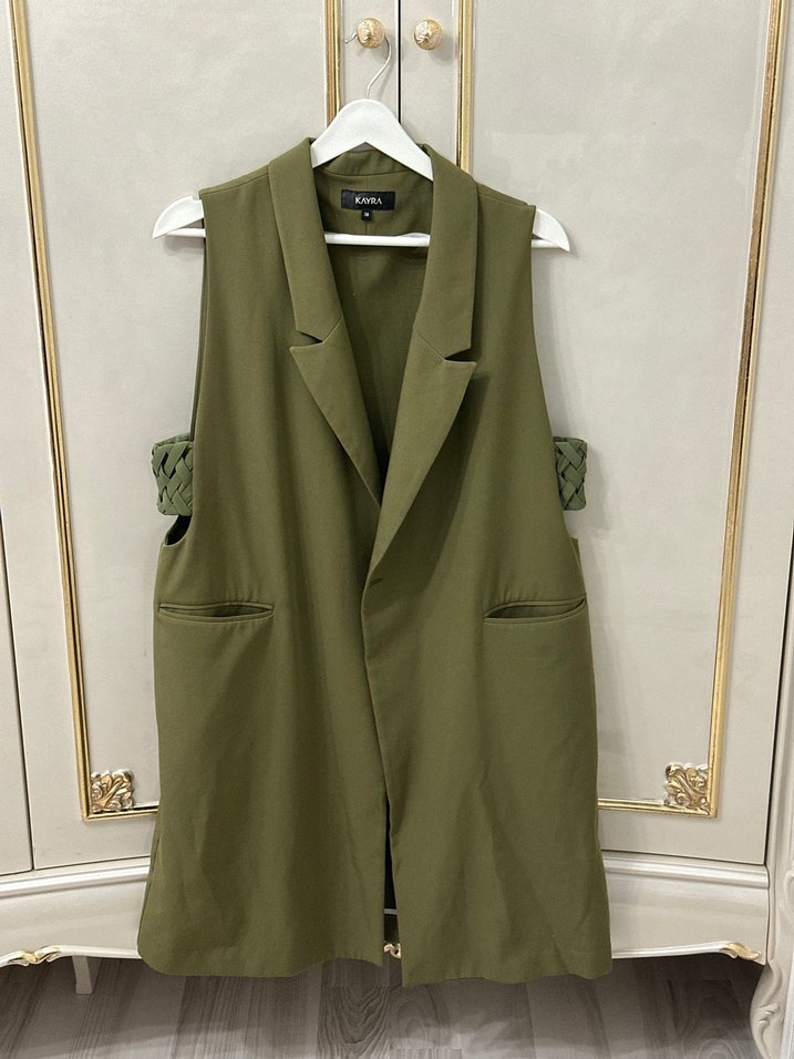 Kemerli, yakası kesimli, uzun kesim kadın yelek. Haki renkte, düz desensiz ve sentetik kumaştan, ofis ve günlük kullanıma uygun.