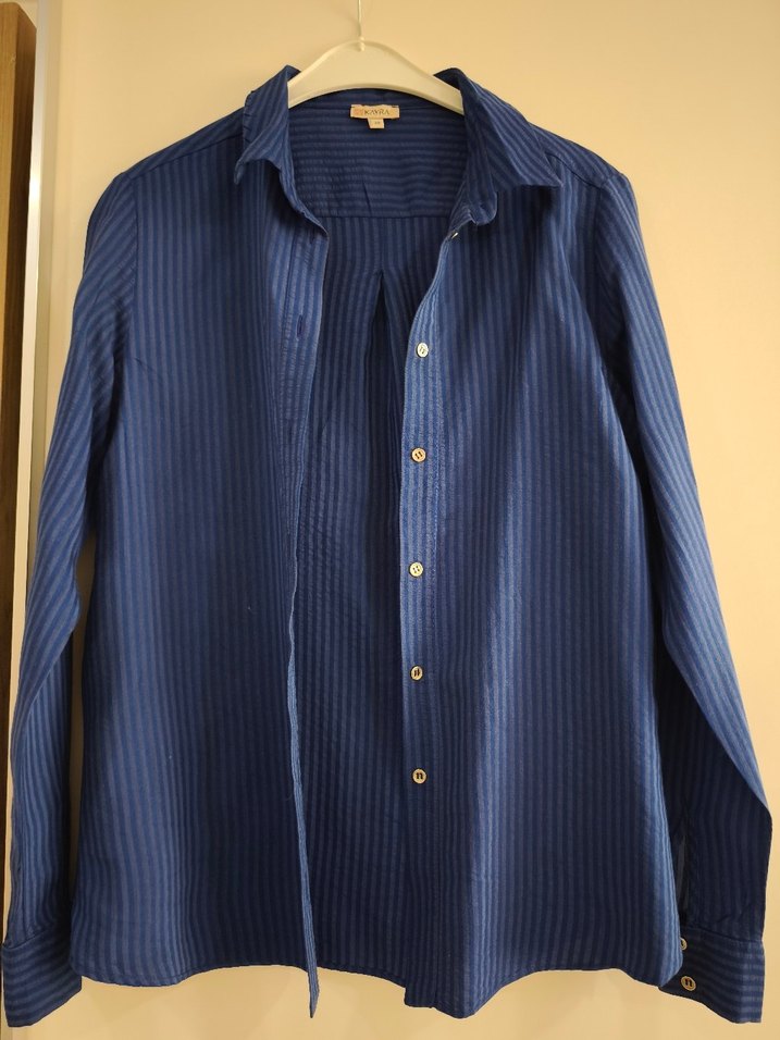 Mavi keten kumaştan, düğmeli ve notched lapel yakalı uzun kollu kadın gömlek. Rahat kesimli, parlak dokulu, ofis kullanımı için uygun.