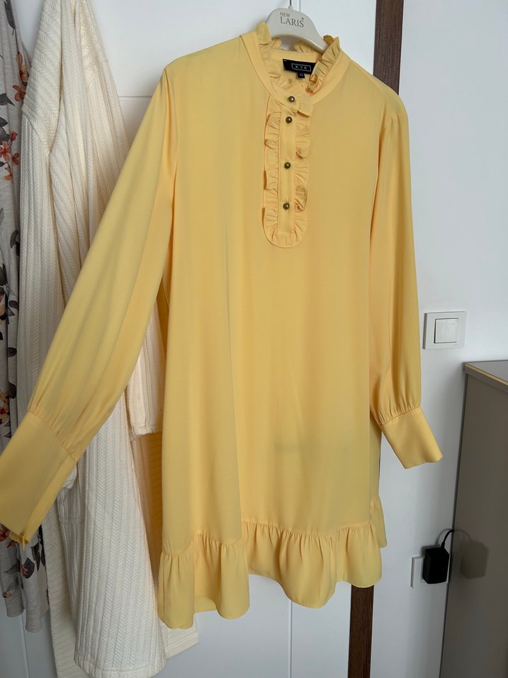 Uzun kollu, yüksek yakalı, fırfır detaylı sarı tunik. İnce nakışlı, ipeksi kumaştan, rahat kesimli, günlük kullanıma uygun. Hiç giyilmedi sıfırdır.