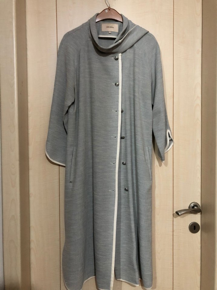 Gri uzun kap,düğmeli ve gevşek kesimdir. Yumuşak keten kumaştan yapılmış, yüksek yakalı ve minimalist normcore tarzındadır. Gri mavi renginde