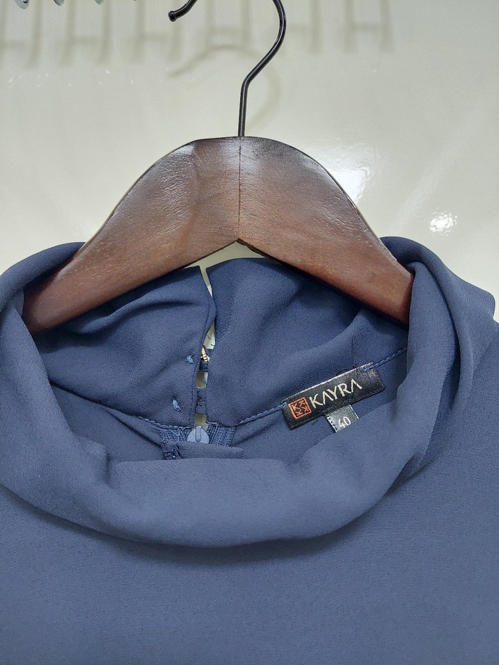 Kayra markalı, düğmeli yüksek yaka ve uzun kollu, ince kesim kadın bluz. Mavi ve gri tonlarda, baskılı, sentetik yumuşak kumaştan üretilmiştir.