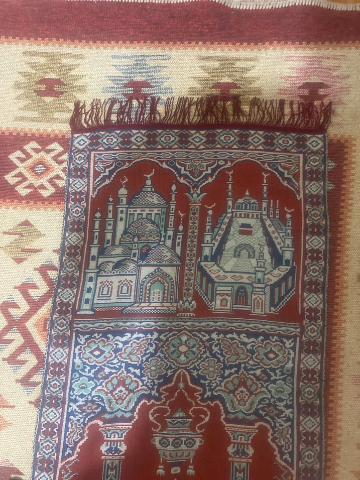 Kayseri Bünyan işi, el dokuma seccade. Pamuk çözgü yün hav, Gördes düğümü. Çifte cami motifli, yaklaşık 40–60 yıllık. Ölçü: 52×103 cm. Kondisyonu iyi, makine değildir