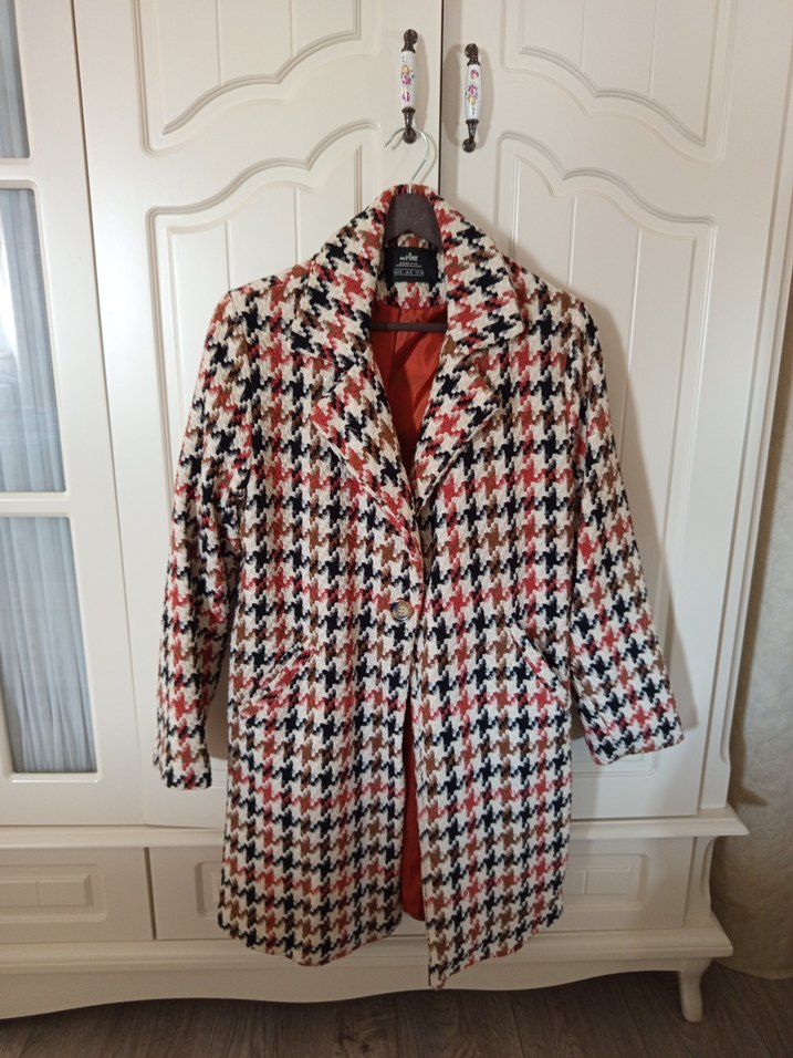 Düğmeli, notched lapel yakalı, uzun kollu,cepli açık koyu renkli karisik çok renkli kareli desenli kaz ayağı desenli bol kesim kaban. Günlük kullanım için uygun herhangi bir deformesi yok. Turuncu siyah kahverengi krem rengi