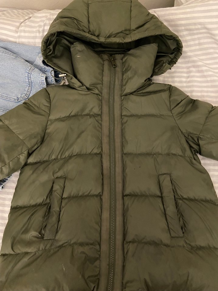 yeşil renkte, kapüşonlu ve fermuarlı, normal midi boyda sıcak tutan mont. Günlük kullanım için uygundur.