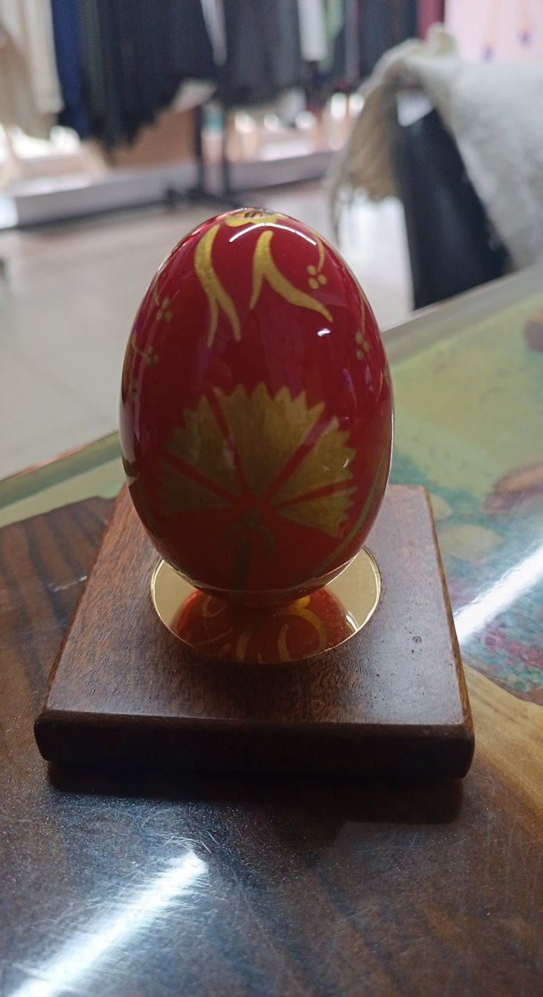 Altın desenli parlak kırmızı yumurta figürin, ahşap bir kaide üzerinde sergileniyor. Gerçek kaz yumurtası süslüyor içi ince işçilik lerle temizlenip güçlendirilerek içten mıknatıs dizayn edilmiş üzeri lalelerle süslenmiş hediyelik ürün