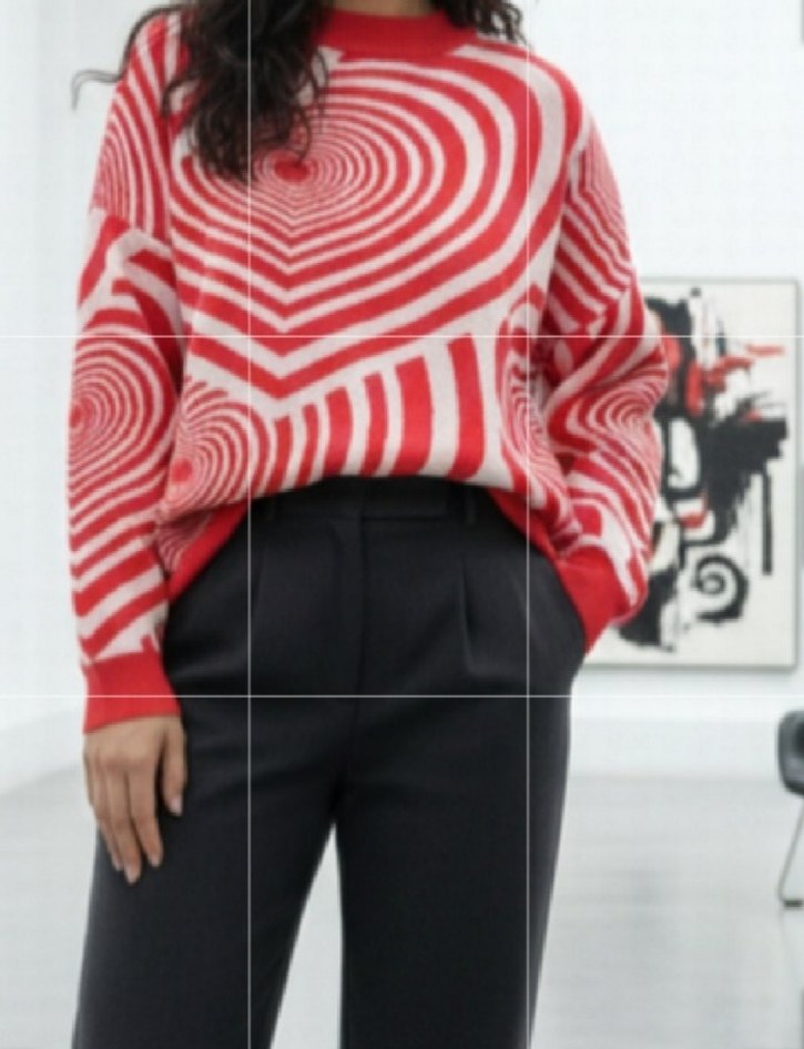 Uzun kollu, yuvarlak yakalı, bol kesim kadın kazak. Renkli Nar çiçeği zebra desenli örgü kumaştan, günlük kullanıma uygun rahat ve çağdaş tarzda. olculeri : boy 75 cm iki kol sırt kısım 72cm basen tarafi yırtmaçlı 66 cm