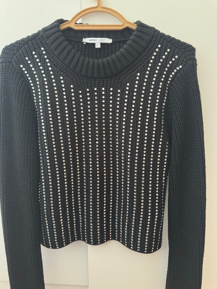 Siyah uzun kollu, bisiklet yaka triko kazak, dikey taş işlemeleri ile detaylandırılmış. Fitted kesim ve normal uzunluktadır. Sıfır ürün