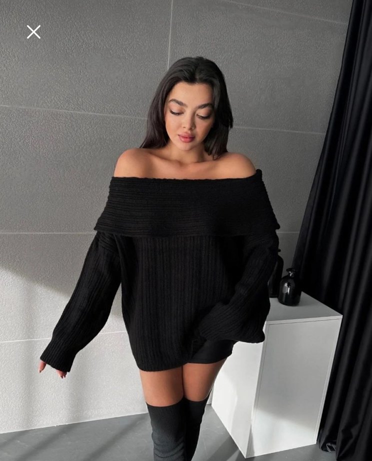 Siyah örgü mini kazak, kayık yaka ve uzun kolludur standart beden