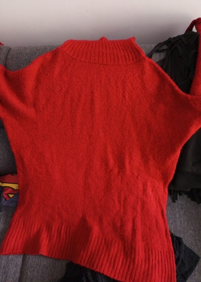 Kırmızı salaş kesim kazak l bedene kadar olur temiz kullanıldı bende iki tane oldugu için satıyorum. Rengi koyu kırmızı normalde ışık açısından o sekilde görünüyor