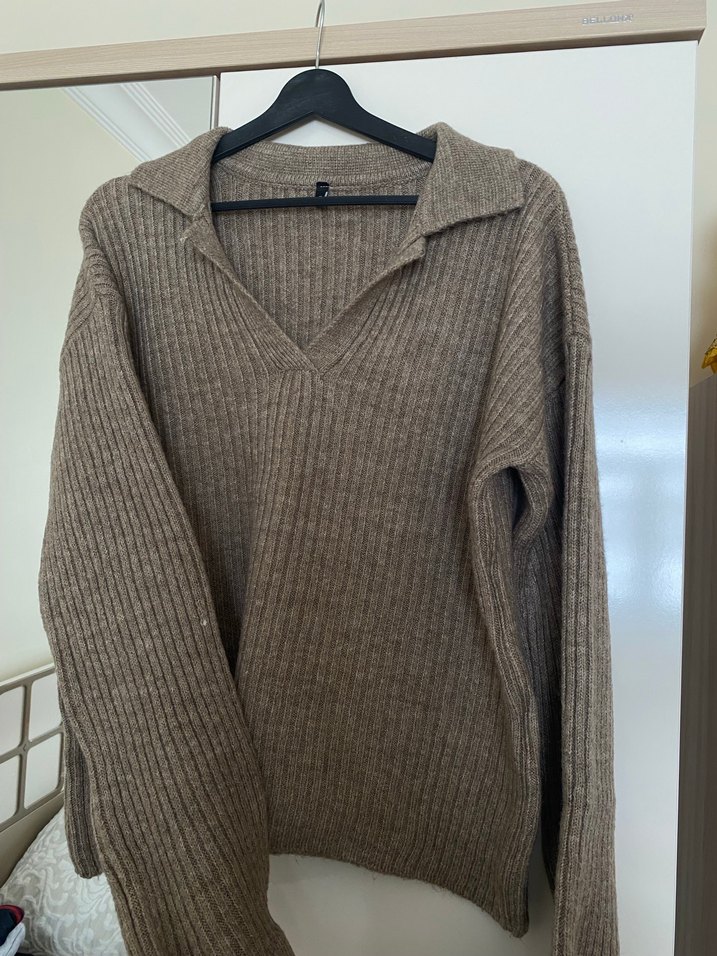 Kahverengi örgü yün kazak, V yakalı ve uzun kolludur. Rahat kesimi ve normal boyuyla günlük kullanıma uygundur. Trendyol Milla marka m beden kolları fırfır detaylı hiçbir deformesi vs yok 1 kere kullanıldı en 58 cm boy 60 cm