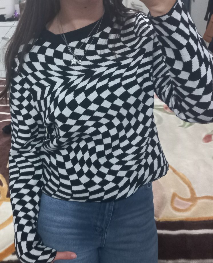S-M beden,az giyildi Kadınlar için siyah beyaz kareli desenli, yuvarlak yakalı ve uzun kollu triko kazak. Rahat kesim, normal midi boy, sentetik örme kumaştan, günlük sokak stili için uygundur.