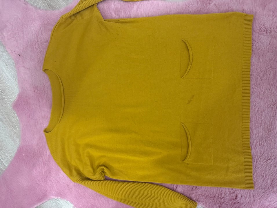 Hardal renkte, boğazlı ve düğmeli detaylı kadın kazak. Uzun kollu, bol kesim ve midi boyda, yumuşak sentetik kumaştan, rahat bir kullanım sağlar.