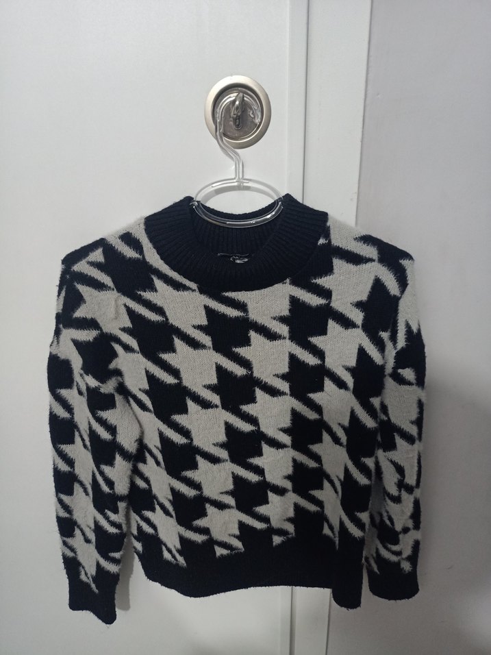 Yün kumaştan örme, yuvarlak yakalı ve uzun kollu kazak. Geometrik desenli, rahat kesim ve normal boyda, günlük sokak modasına uygun.